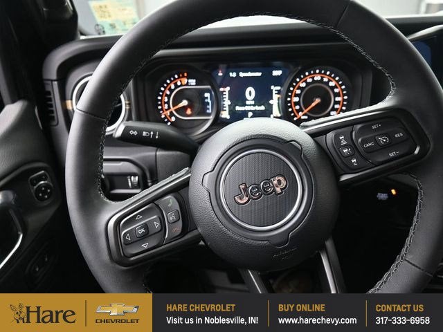 97 MPH Vehicle Max Speed Calibration, Advanced Brake Assist, AM/FM radio: SiriusXM, Apple CarPlay/Android Auto, Automatic Headlamps, Body Color 3-Piece Hard Top, Body Color Fender Flares (2-Piece), Brake assist, Cloth Low-Back Bucket Seats, Convenience Group, Corning Gorilla Glass, Daytime Running Lamp System, Deep Tint Sunscreen Windows, Delay-off headlights, Electronic Stability Control, Emergency/Assistance Call, Freedom Panel Storage Bag, Front Door Locks 2-Door Passive Entry, Front fog lights, Full Length Floor Console Premium Armrest, Full Speed Forward Collision Warning Plus, Hard Seat Back, Heated Front Seats, Heated Steering Wheel, High Tide, High Tide Tailgate & Hood Decals, Integrated Radar Camera Module (IRCM), Leather Wrapped Park Brake Handle, Leather Wrapped Shift Knob, Outside temperature display, ParkView Rear Back-Up Camera, Power 4-Way Driver Lumbar Adjust, Power 4-Way Passenger Lumbar Adjust, Power Adjust 8-Way Driver Seat, Power Adjust 8-Way Front Passenger Seat, Power Heated Mirrors, Premium Door Trim Panel, Premium McKinley Trimmed Seats, Premium Wrapped Steering Wheel, Quick Order Package 24Q High Tide, Radio: Uconnect 5 w/12.3 Display, Rear Armrest w/Cupholder Seat, Rear Sliding Window, Rear Window Defroster, Remote Start System, Security Alarm, Steering wheel mounted audio controls, Sun Visors w/Illuminated Vanity Mirrors, Telescoping steering wheel, Traction control, Universal Garage Door Opener, Wheels: 17 x 7.5 Painted Black, Willys Suspension.